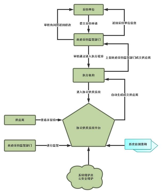 二、采購系統(tǒng)進行流程 本系統(tǒng)在發(fā)生采購需求時,各級采購單位應將業(yè)務需求、技術規(guī)格、售后服務、采購數(shù)量、采購預算金額等內容上報給政府政府采購管理辦公室,由政府政府采購管理辦公室交由執(zhí)行機構統(tǒng)一錄入進本系統(tǒng),由本系統(tǒng)進行自動項目編號,